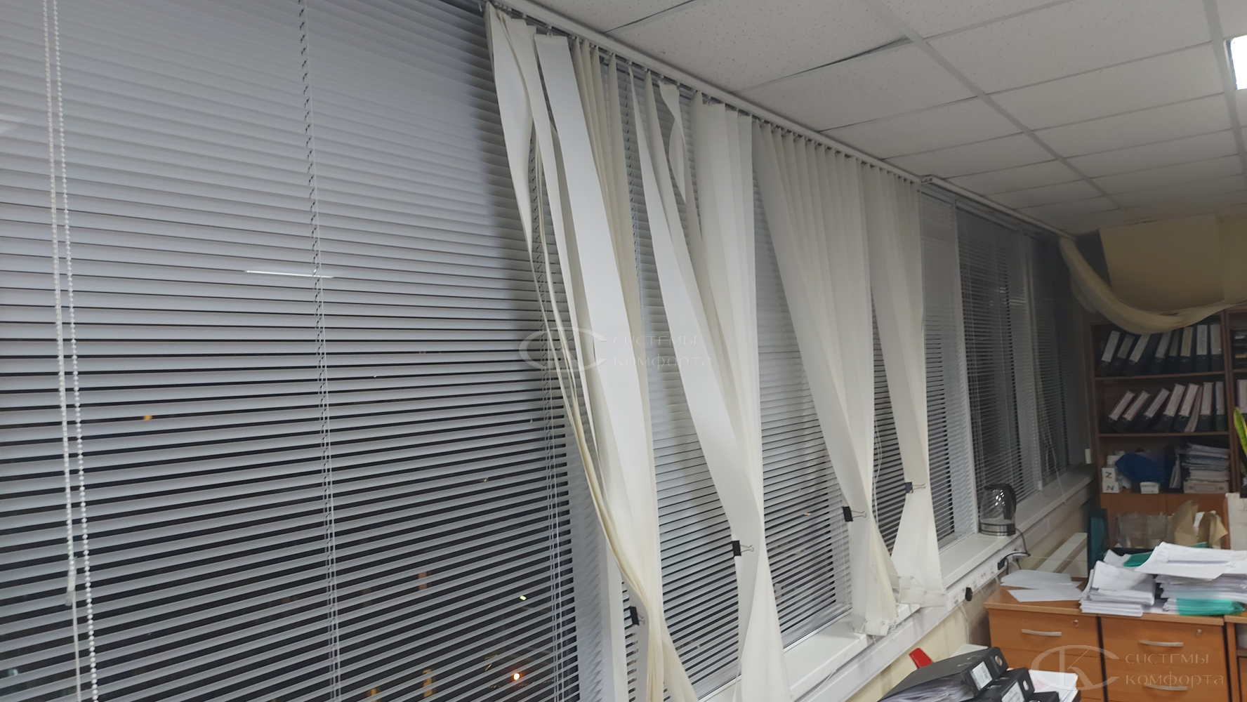 Чистка ламелей проводится в закрытом состоянии обычной влажной губкой. В случае сильного загрязнения воспользуйтесь мыльным раствором. При необходимости изделия можно снять с окна.